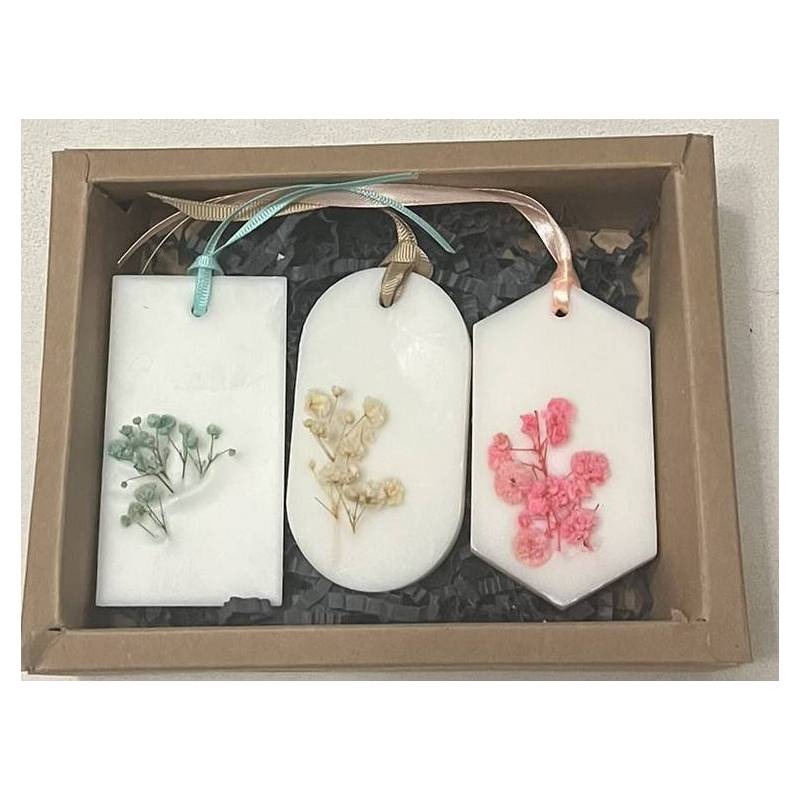 Ένα κομψό σετ από χειροποίητα αρωματικά χώρου, φτιαγμένα με προσοχή στη λεπτομέρεια και διακοσμημένα με αληθινά αποξηραμένα λουλούδια, τοποθετημένα ένα-ένα στο χέρι.